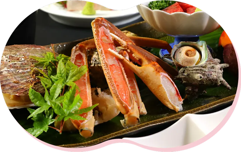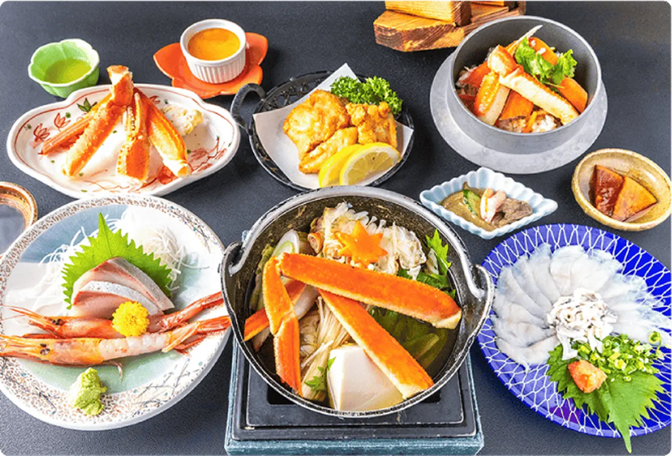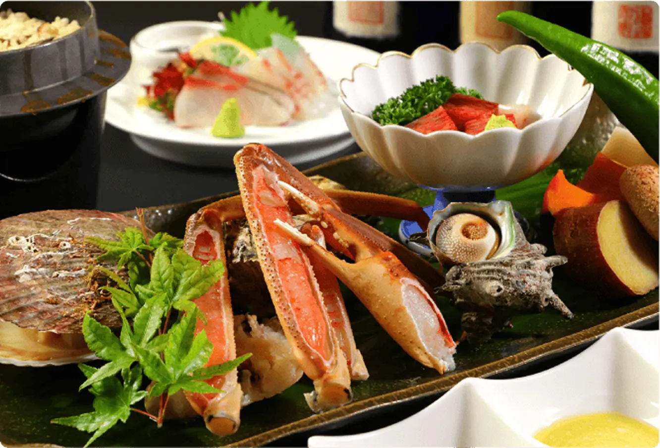 日本海の冬の贅沢、若狭ふぐ、かに、ぶりを一度に味わう特別な逸品。デザートまで楽しめる。冬御膳(上)はさらに蟹刺付。