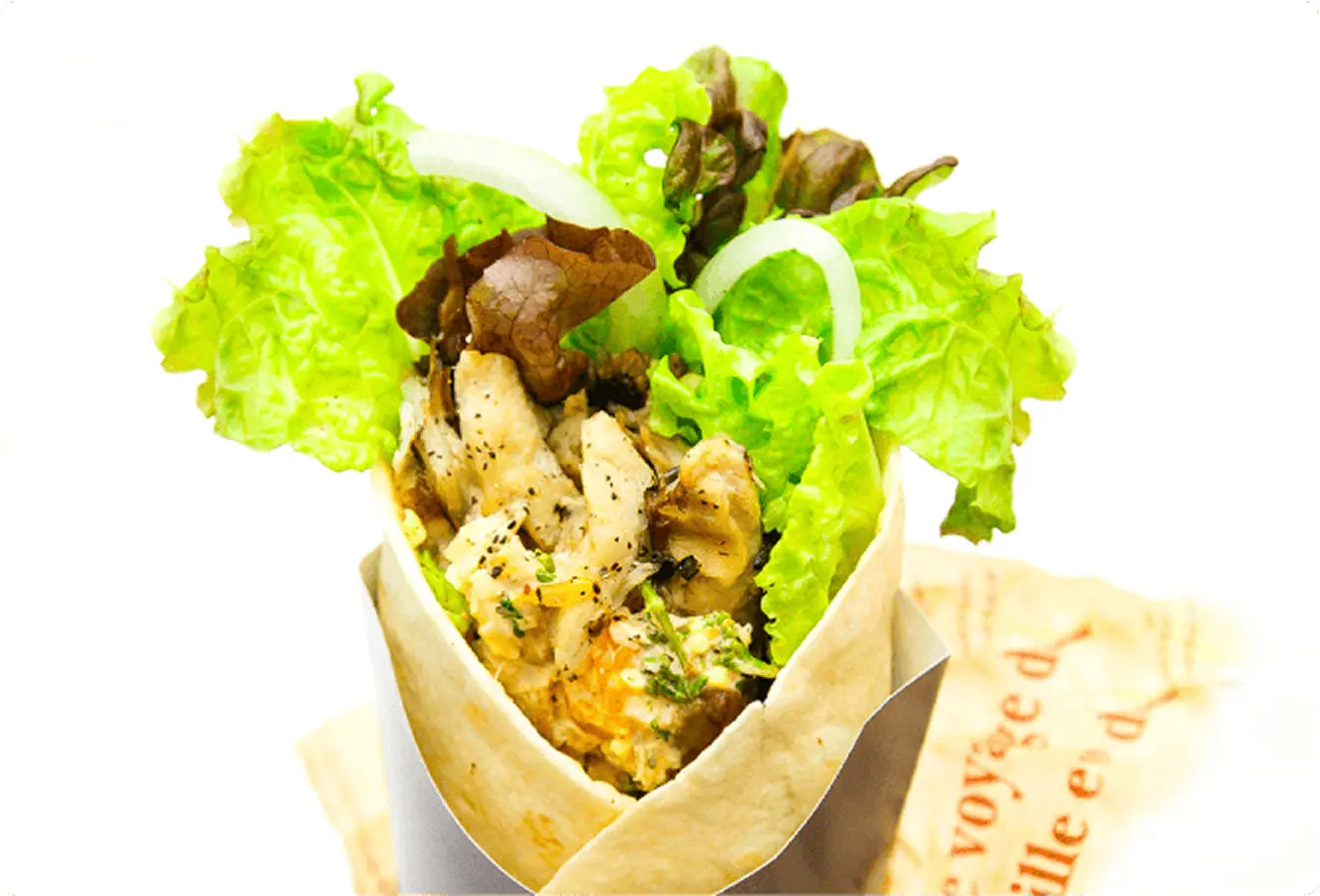 福井名物の浜焼きさばがごろっと入った、野菜たっぷりのサンド。トルティーヤ生地で包んだ満足ボリュームの一品!
