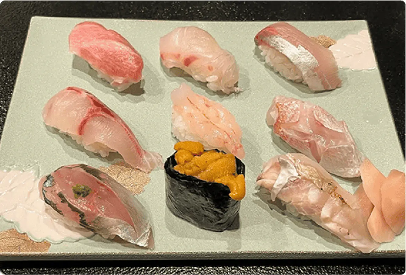 敦賀漁港で水揚げされた魚を中心に10貫または13貫、1貫ずつご提供いたします。