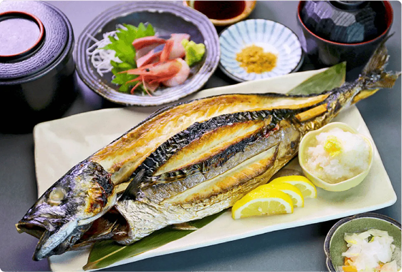 脂ののった熟成さばを職人の技で姿焼きに。丸ごと一本を香ばしく焼きあげた福井名物、当店自慢の御膳です。