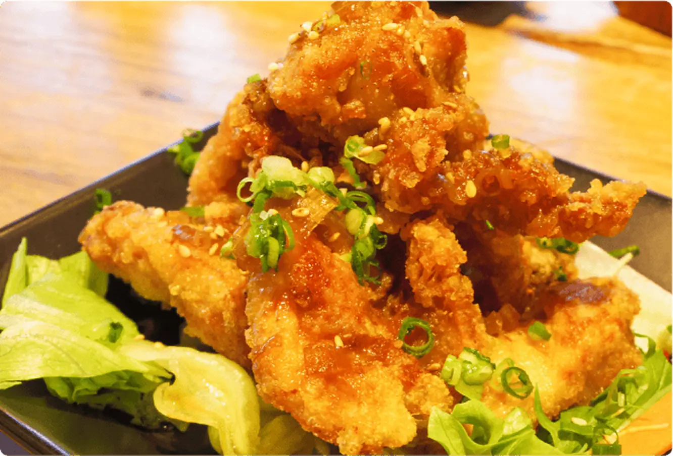和伊和伊亭の看板料理「若鶏唐揚げ和伊和伊ソース」は是非お試しいただきたい料理の一つ。店内で食べてもテイクアウトでも。大人気の一品です。