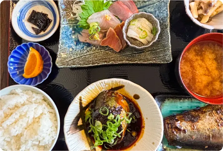 新鮮・旬な魚介類とふっくらごはん。素材の旨みを活かした一膳で、ほっとする幸せ時間を提供いたします。